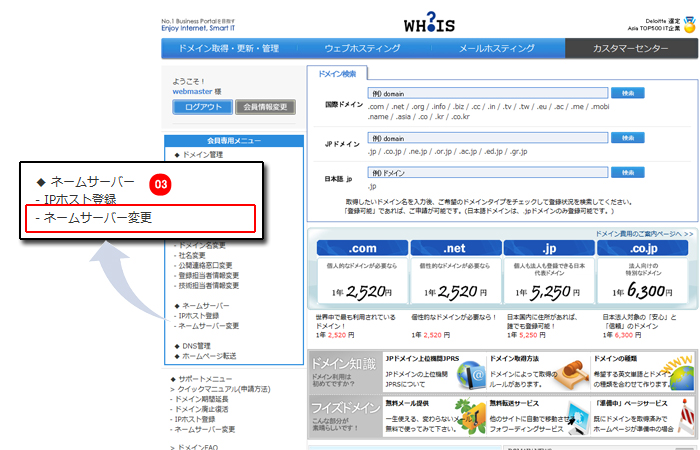 「ドメイン管理センター」メニューから「ドメインネームサーバー変更」をクリックします。 |