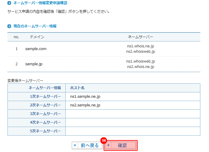 変更するネームサーバー情報を入力して、「次へ進む」ボタンをクリックしてください。 |